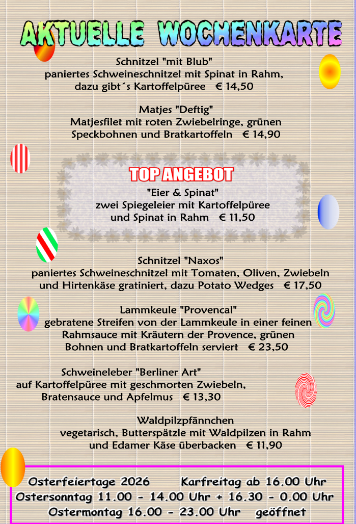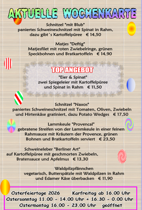 Dienstag + Mittwoch Ruhetag